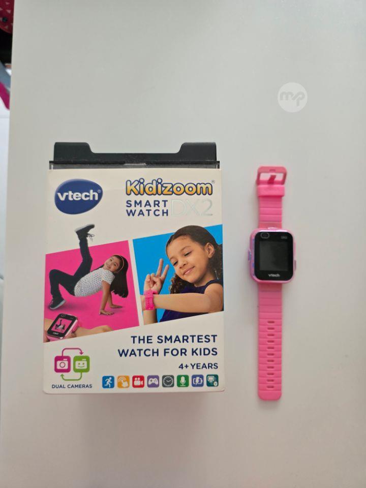 Vtech pink watch with both analogue and digital time, takes photos, has games. With BOX.