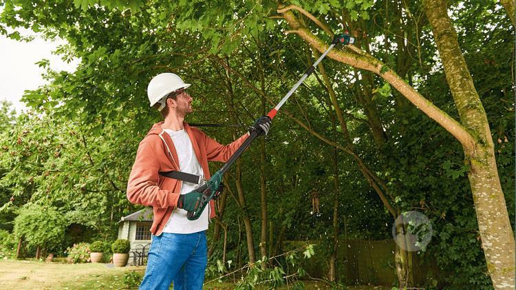 The telescopic pole allows for a wide range of action, allowing the user to remain safely positioned at ground level