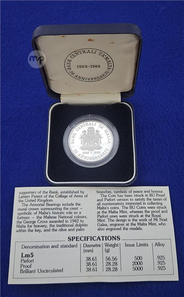 1968-1988 20th Anniversary of the Central Bank of Malta 56.56g, .925 silver issue limit 500 PIEDFORT / PIEFORT