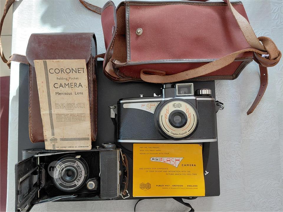 2 Antique Cameras - (Coronet Folding Camera) & AGI Flash Camera (probably 1950s).