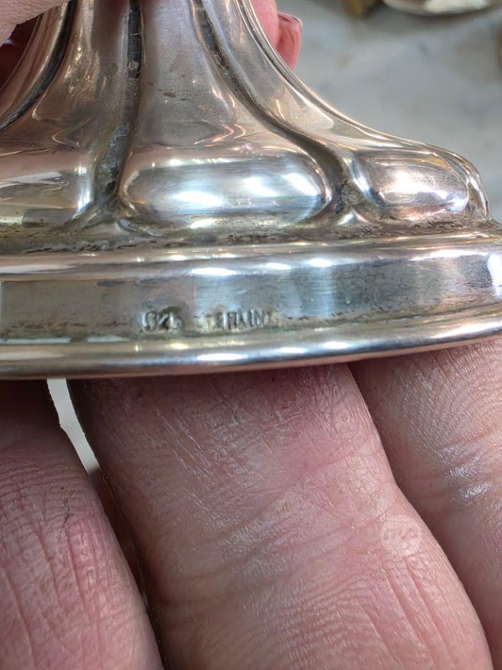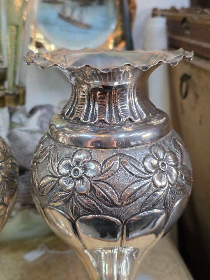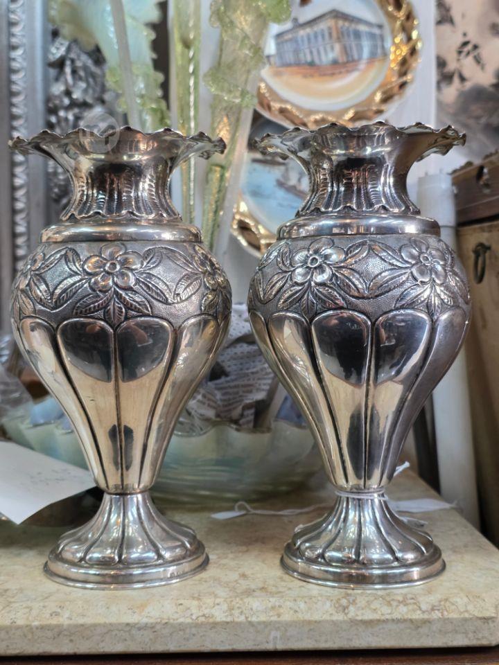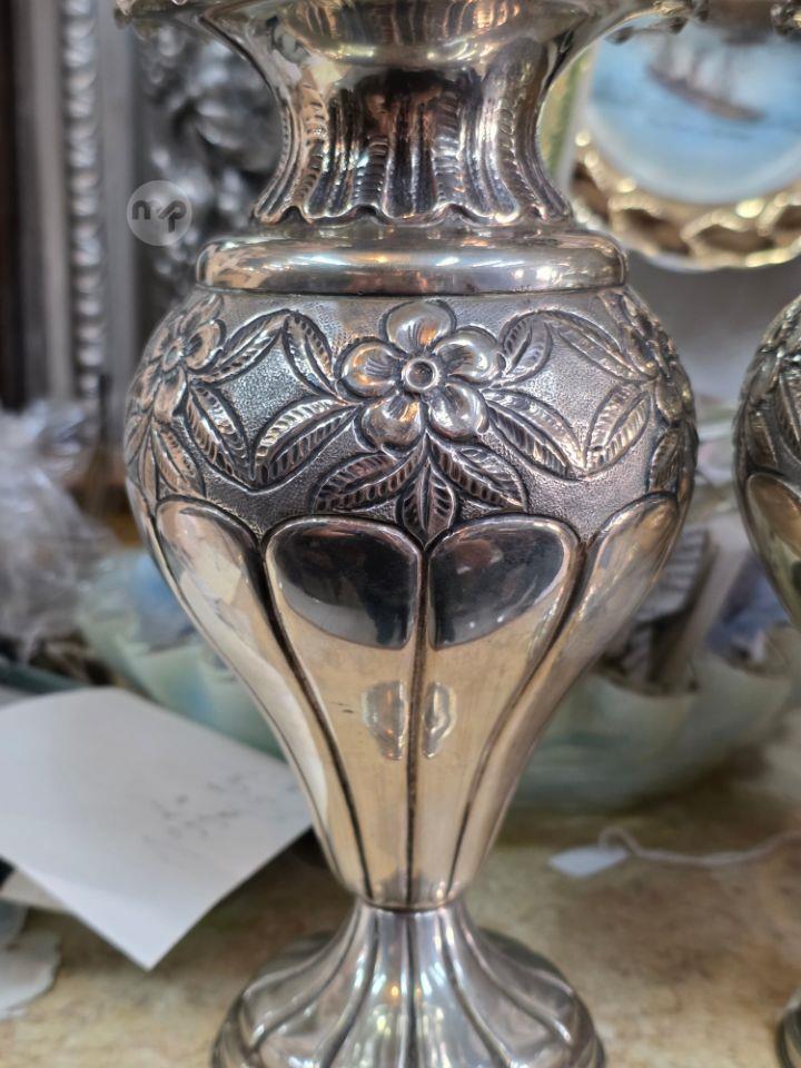 Pair 925 Sterling Silver Vases,chased floral motifs and a fluted design.