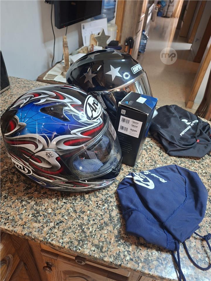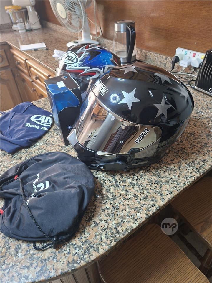 Simpson venom helmet (xxl) and Arai Viper GT helmet (m) c/w Cardo Pak talk bold duo coms kit (JBL edition) .