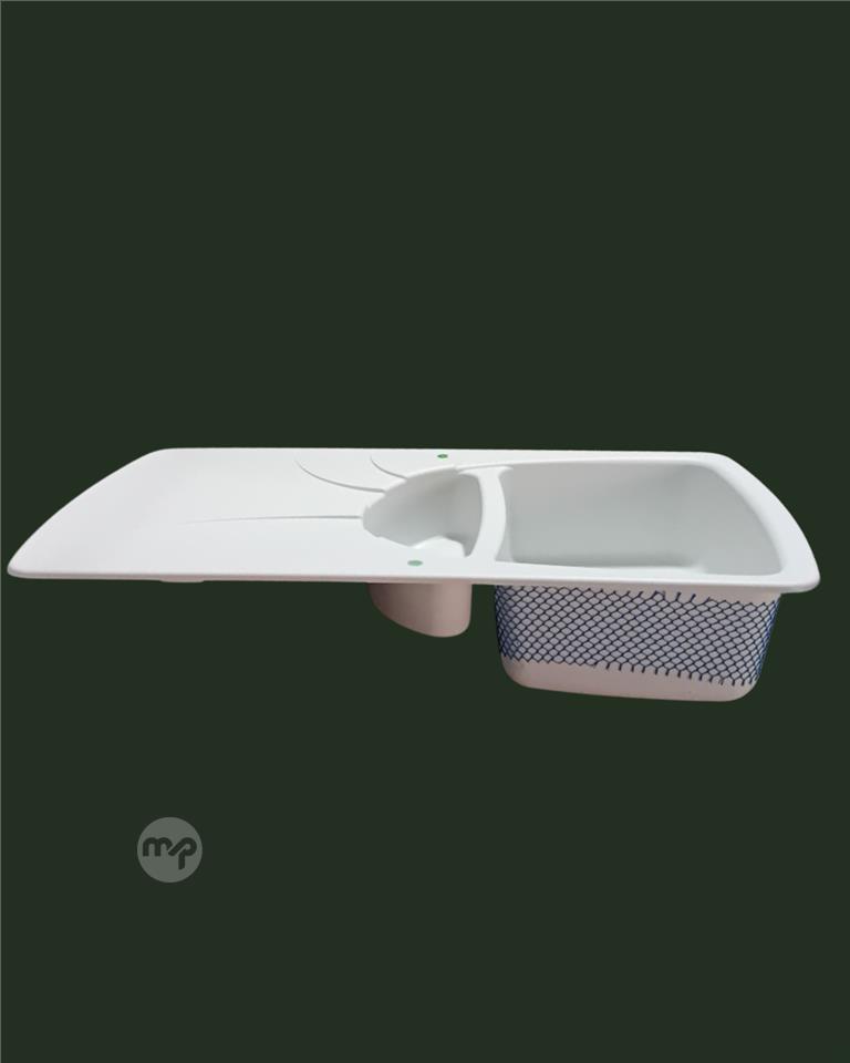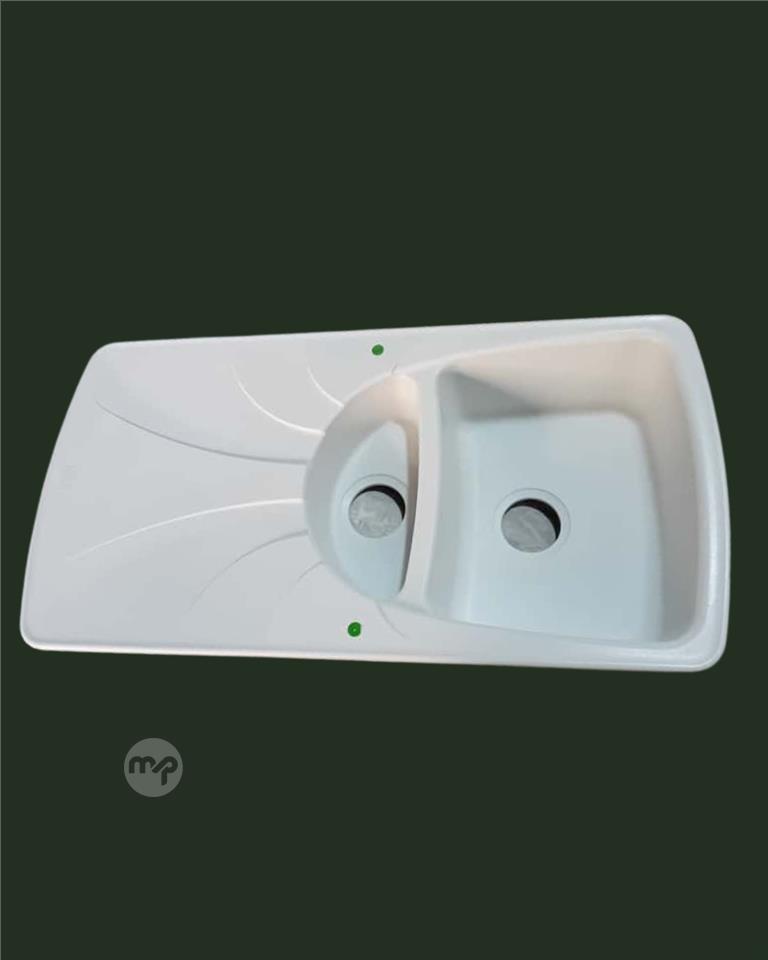 1.5-bowl sink with integrated drainer in polar white finish. Practical layout with a large main bowl and smaller round prep bowl.