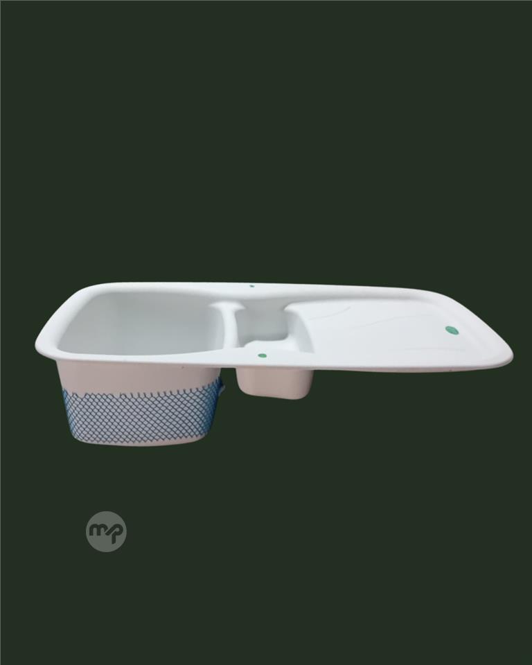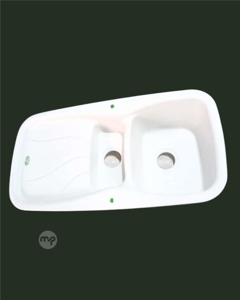1.5-bowl sink with integrated drainer in polar white finish. Large main bowl + compact side bowl.