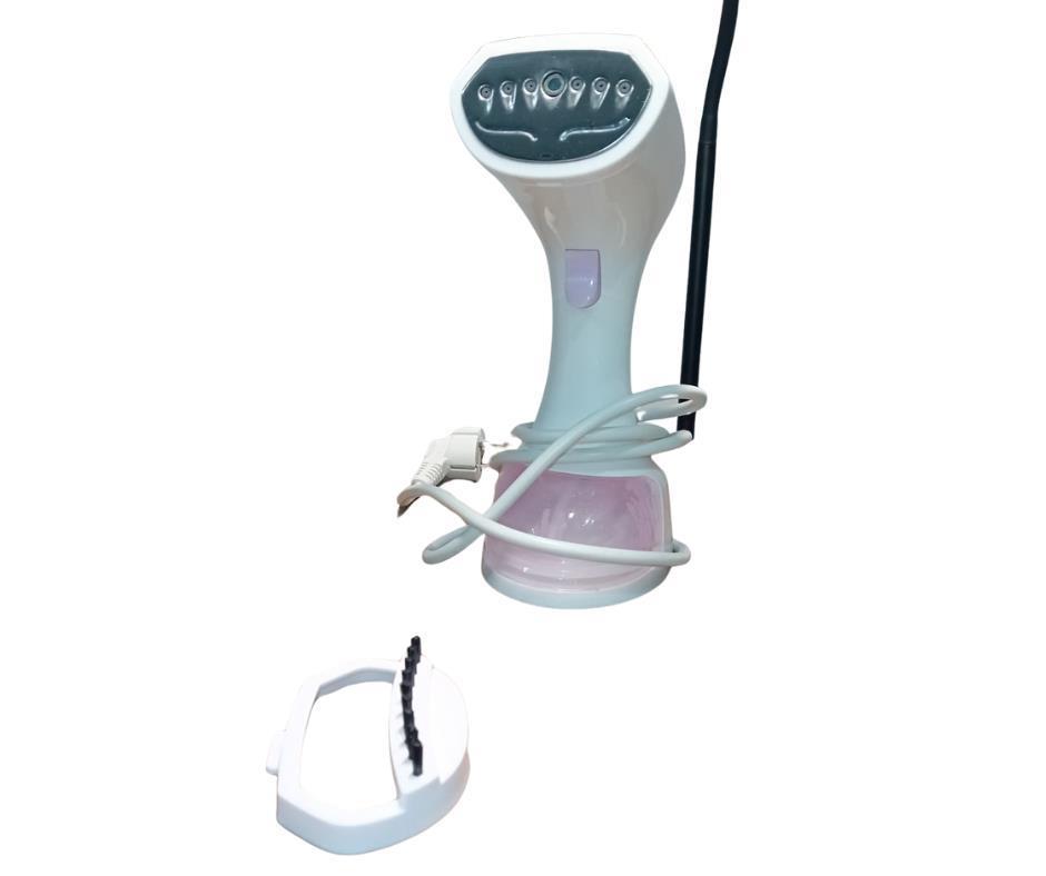 Compact, lightweight, fast-heating steamer (220-240V EU plug). Includes lint brush. Perfect for travel and quick touch-ups.