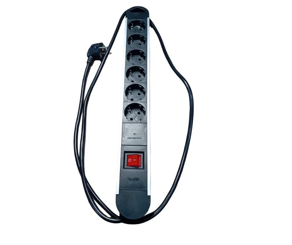 6 Schuko sockets (EU plugs), illuminated red on/off switch, built-in surge protector (green LED indicator).