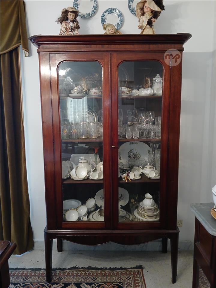 Victorian dining room set - sideboard with marble top, showcase, solid dining table with four chairs.