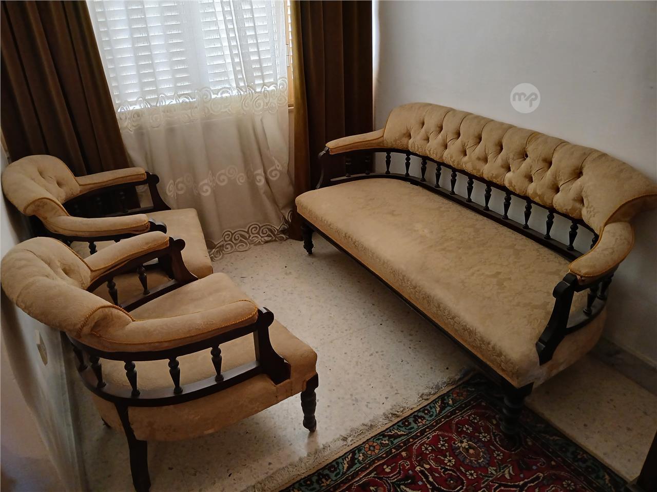 Old sitting room suite - sofa, armchair, coffee table, two small tables with drawers.