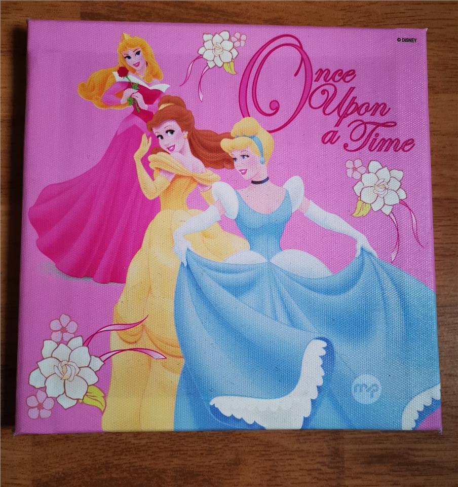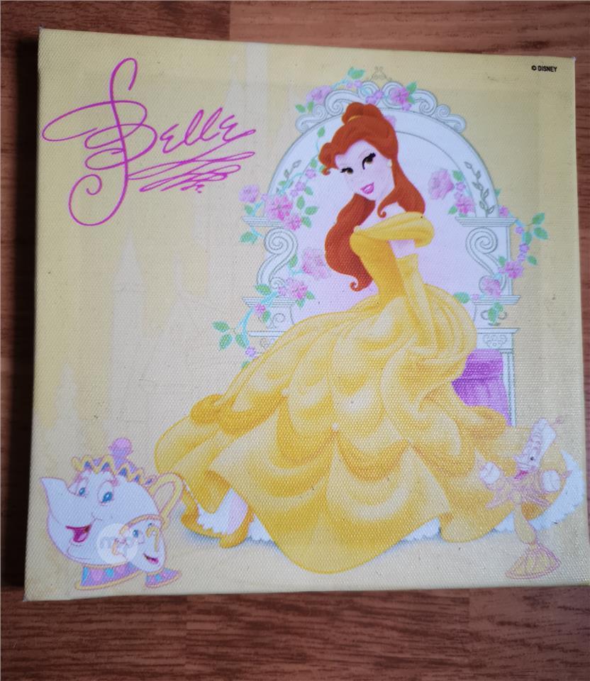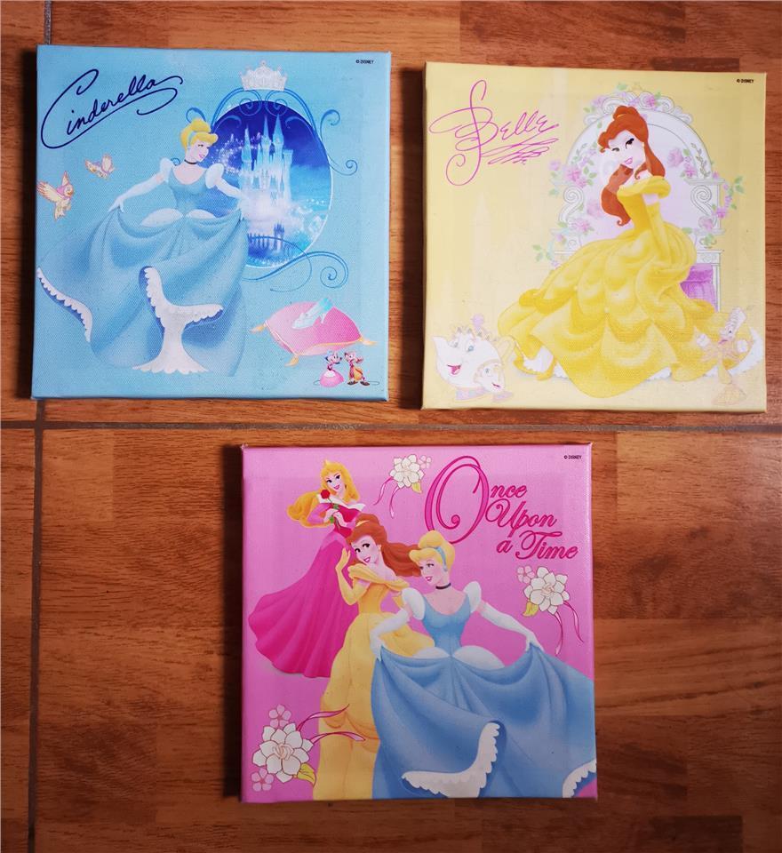 Set of 3 Disney Princess canvas pictures-Princess Belle, Princess Cinderella and Princess Aurora. Each one is 20cm by 20cm. Perfect to decorate any child's bedroom wall. To be sold together for only €12.They are still like new as can be seen.