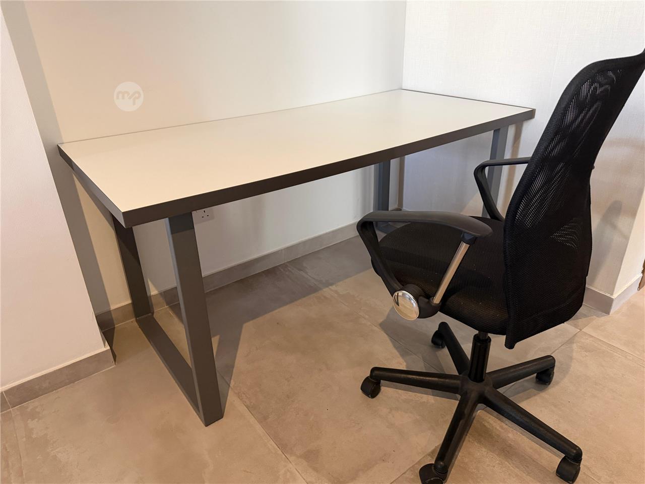 The desk has a white top with a grey metal frame and looks clean and modern – plenty of space for a PC, monitor and paperwork (see photos). Desk size: approx. 160 x 75 cm.