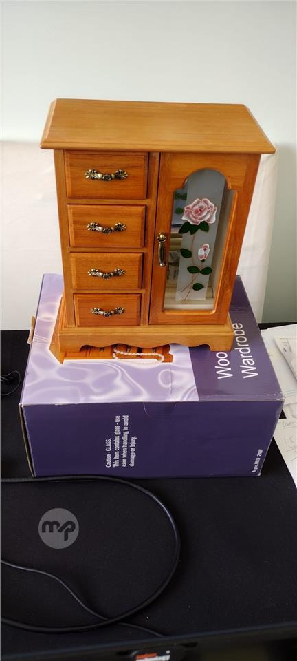 Beautiful wood jewelry box, in the shape of a miniature wardrobe.