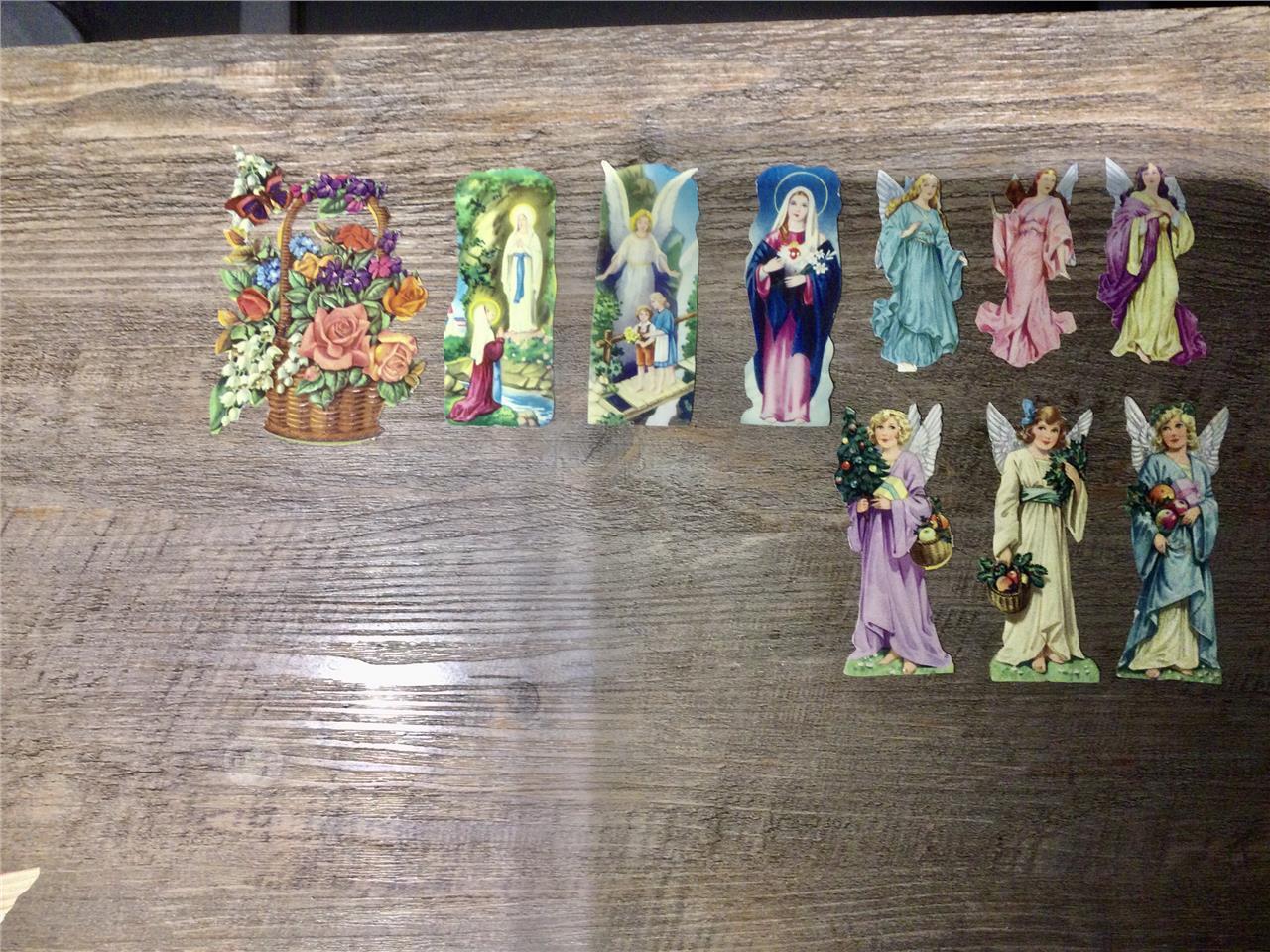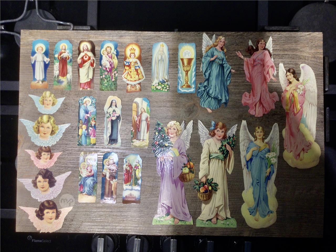 Scrap paper angels and holy pictures from the 1970s but still in very good condition. Height of large paper angels is 16 cm.