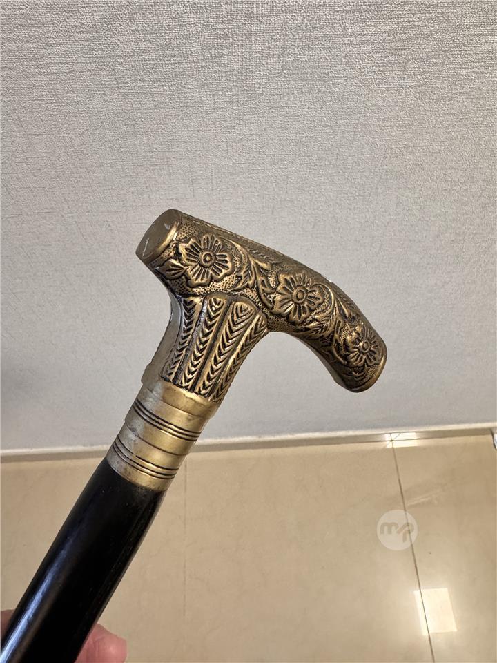This listing is for a vintage walking stick featuring a sleek black shaft and an ornate decorative handle. The handle has an elegant carved look with metallic accents that give it a classic, distinguished appearance. It is ideal for collectors, costume use, display, or as a stylish accessory.