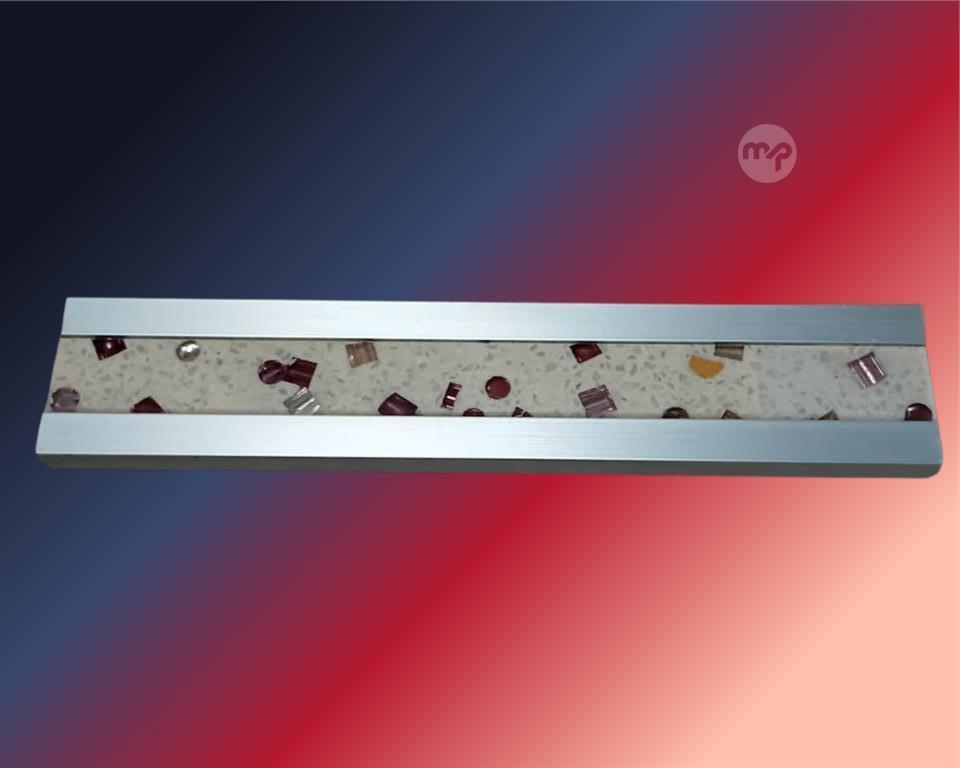 Slim aluminium-edged ceramic border with authentic terrazzo look: off-white base scattered with colourful marble chips in burgundy, purple, beige, and hints of orange & black. Retro-vintage vibe – ideal for mid-century, industrial, or eclectic bathroom/kitchen accents.