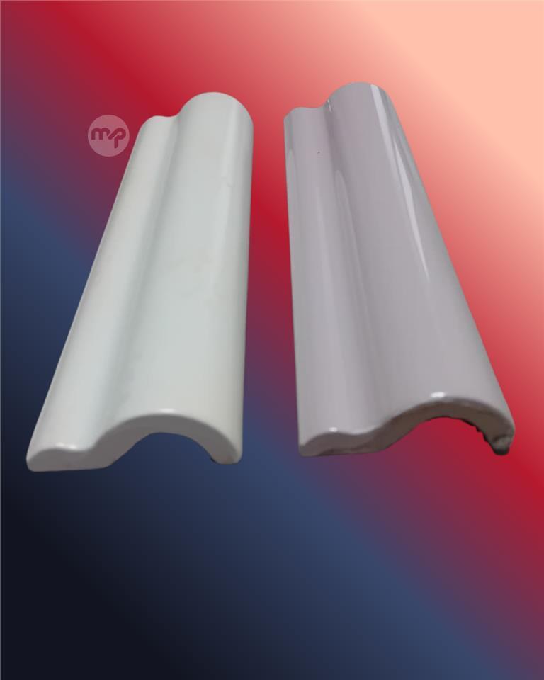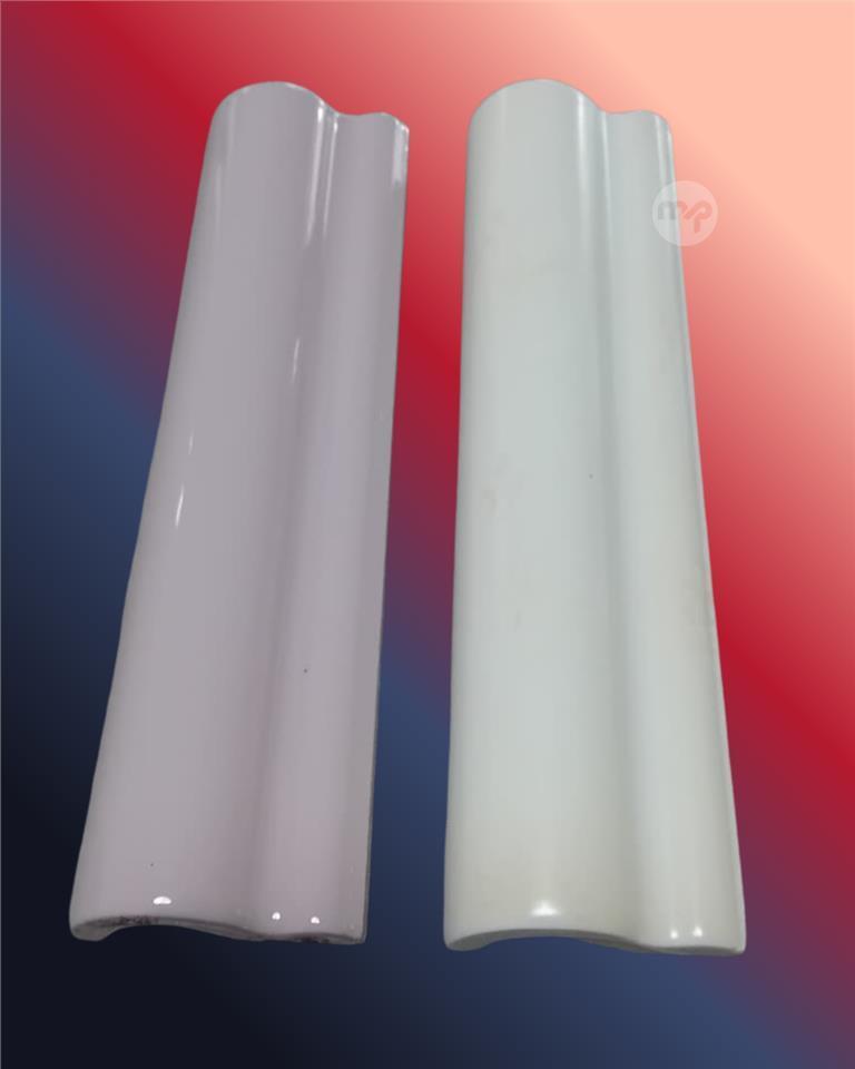 Smooth glossy ceramic double-bullnose finishing strips in two versatile neutral shades: