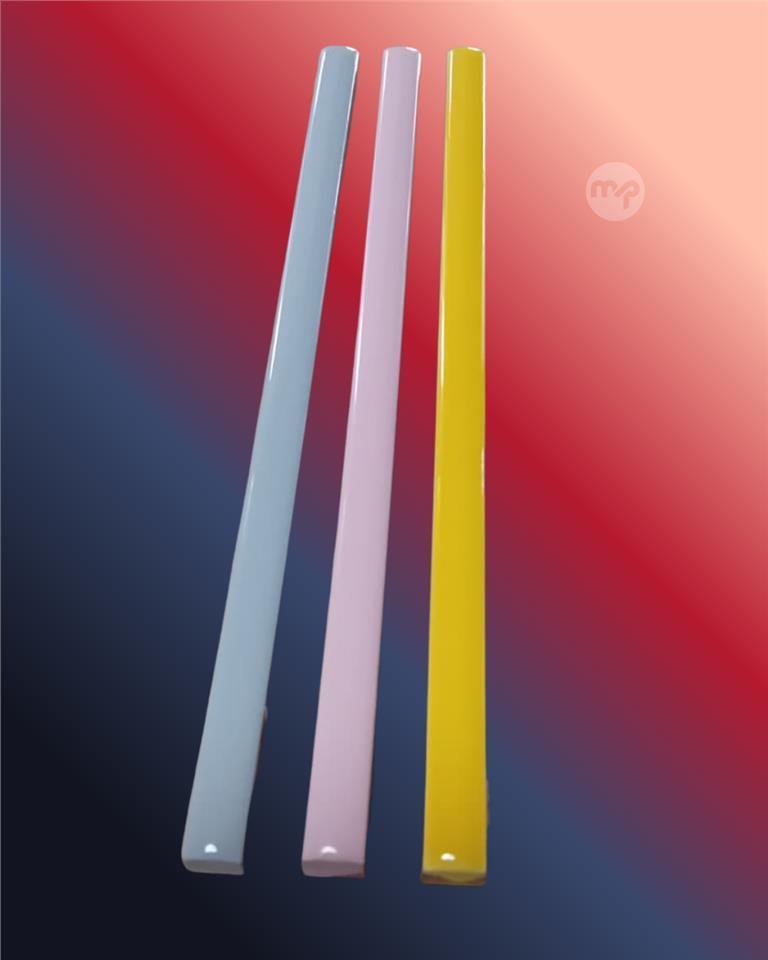 Bright, smooth, high-gloss ceramic pencil trims in three vibrant colours: soft baby blue, gentle pastel pink, and bold sunny yellow. Perfect for adding a clean, modern accent to kitchens, bathrooms, feature walls, or colourful borders.