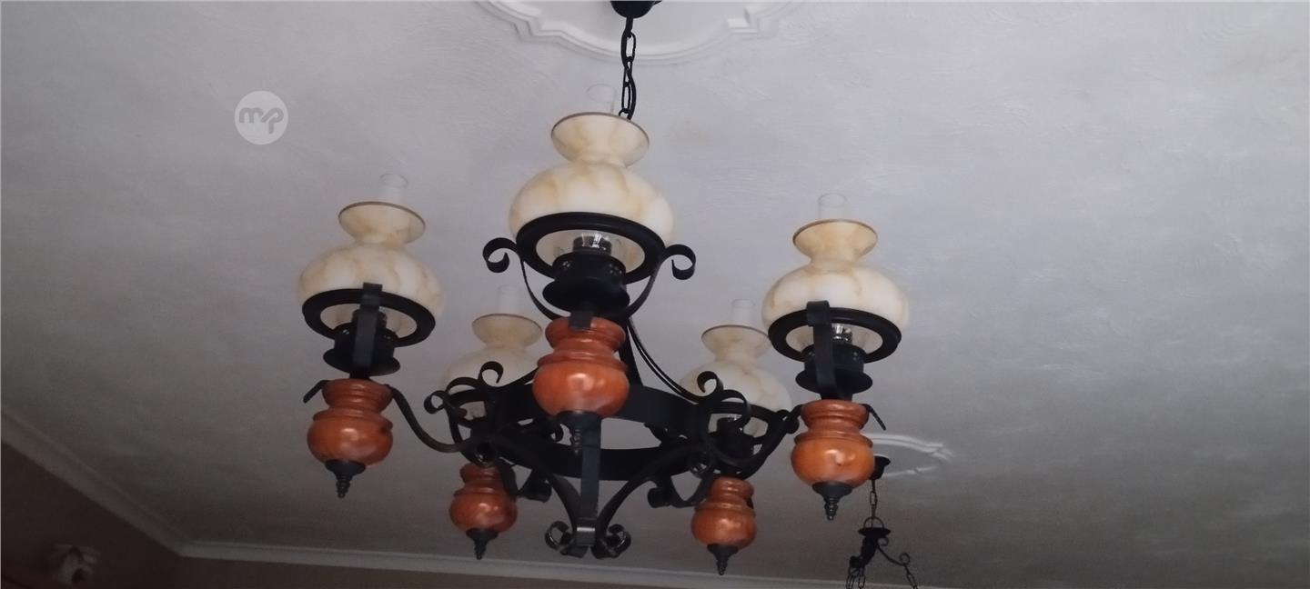 2 chandeliers x 5 lights and one round. Ferrobattuto and wood material