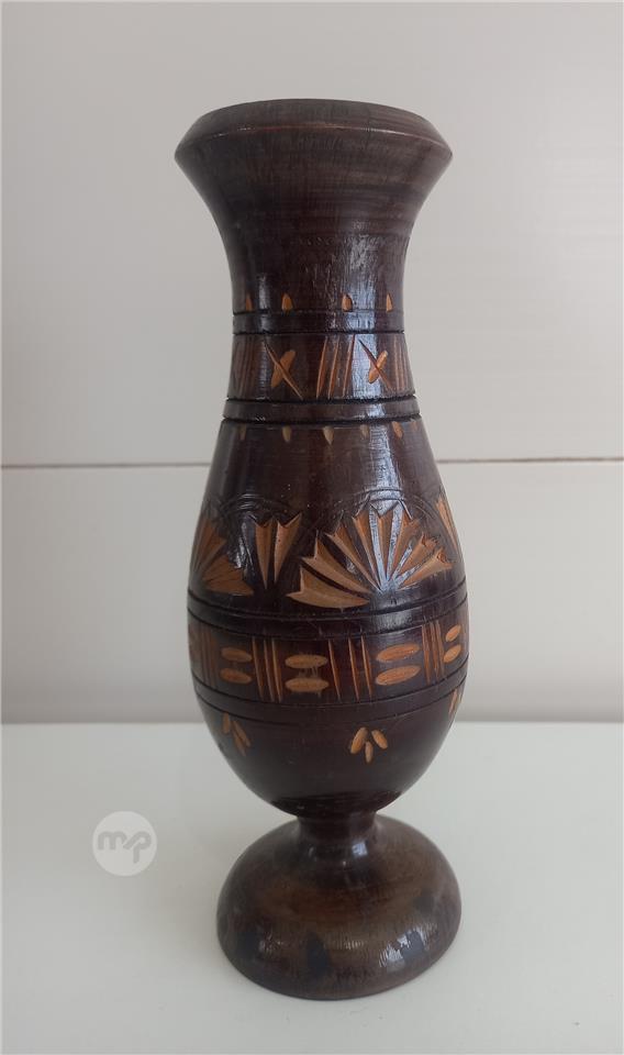 Vintage 80s wooden handmade small vase, brown hand carved floral design ornaments vase