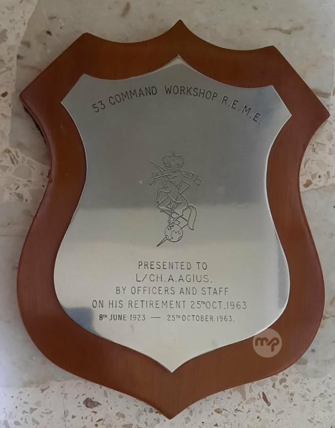 53 Command Workshop R.E.M.E. presentation Wall Plaue to L/CH A.Agius who worked there from 1923 to 1963
