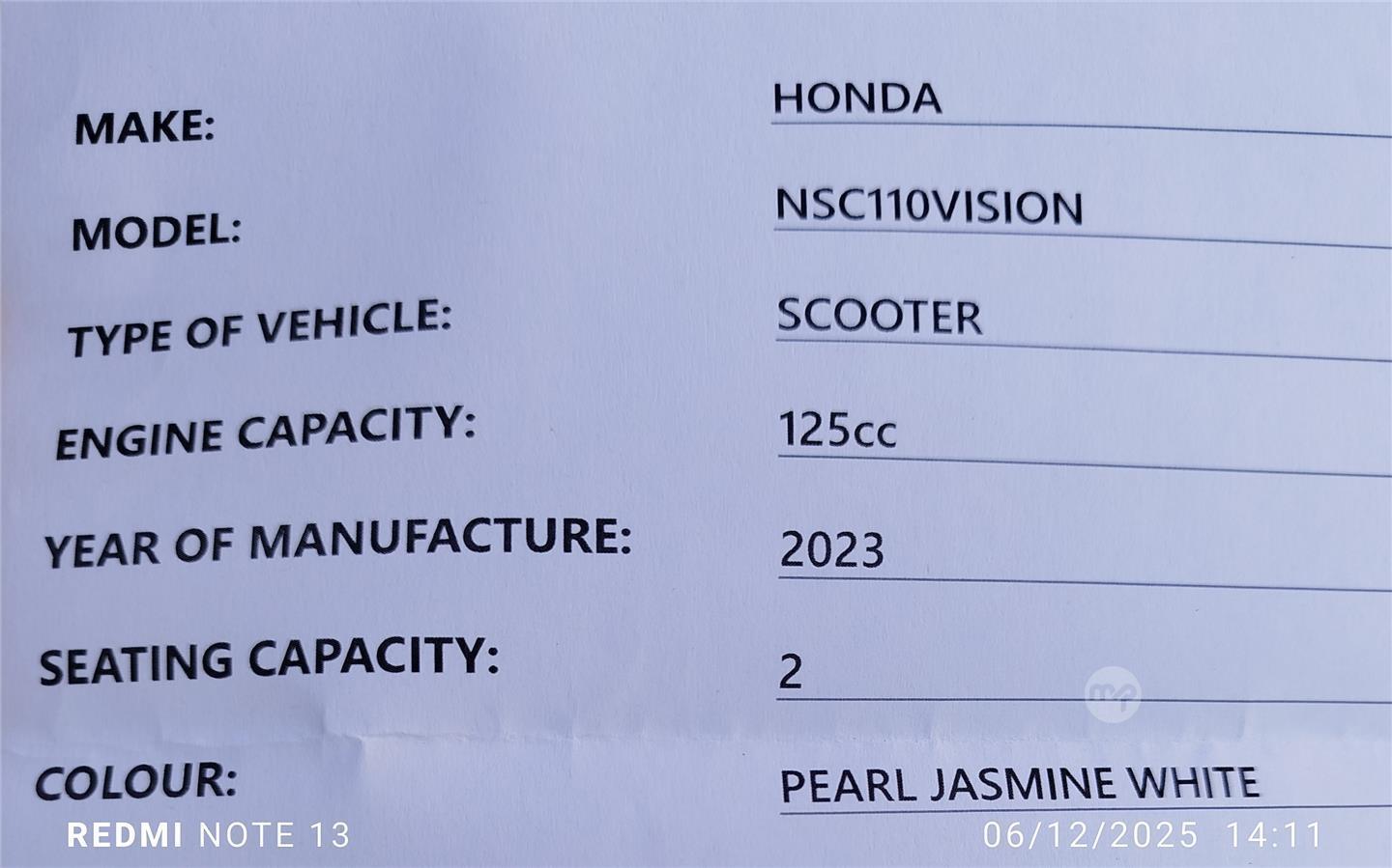 Honda vision 110. 919 km only hardly used .