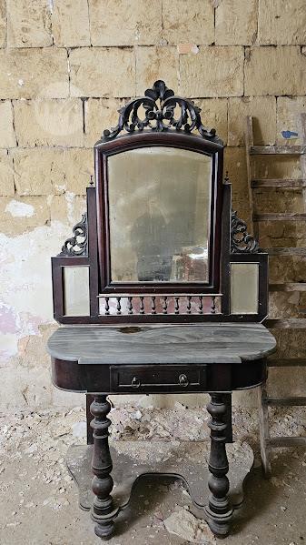 Ornate solid wood vanity with 3 mirrors and marble countertop