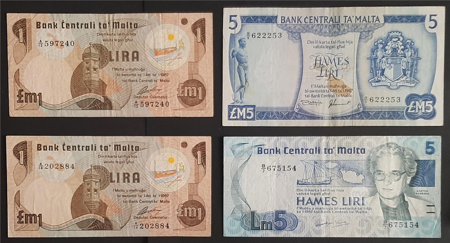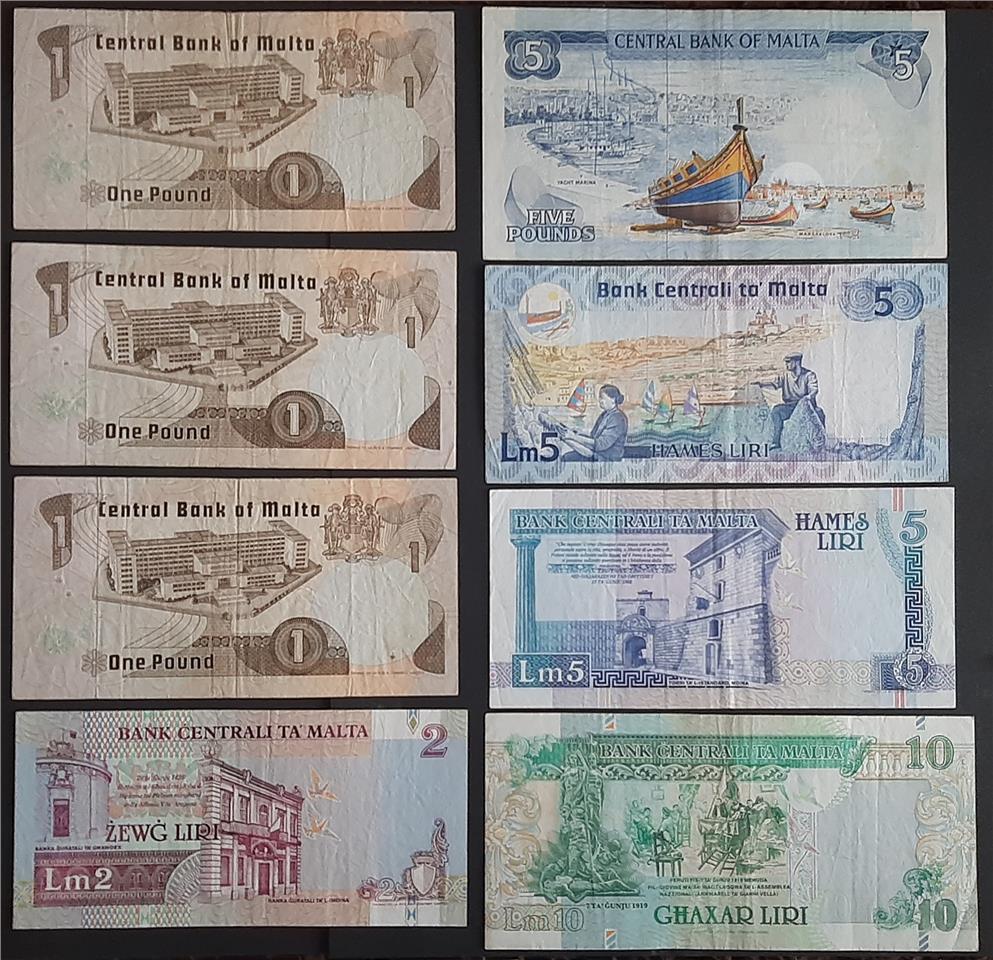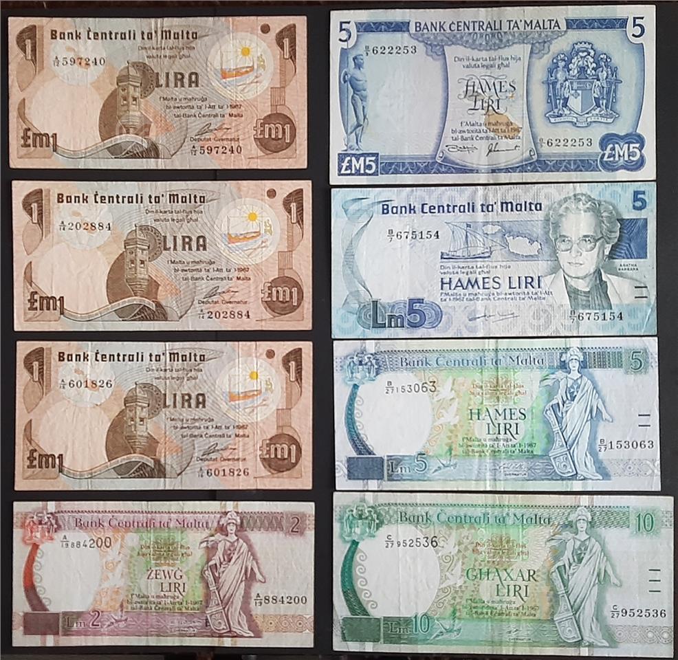 8 BANK CENTRALI TA' MALTA VARIOUS BANKNOTES - Lm10, Lm5 (3), Lm2 & Lm1 (3)