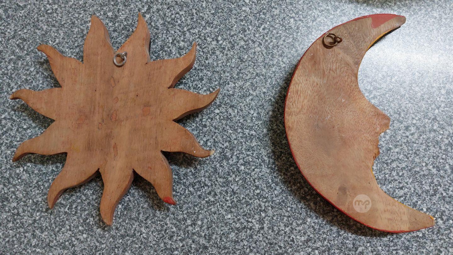 Set of two decorative wall hangings – sun and moon faces with colorful accents. Great for boho, rustic, or celestial-themed interiors. €20 for both.