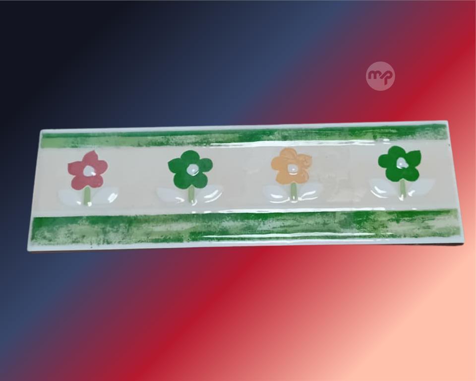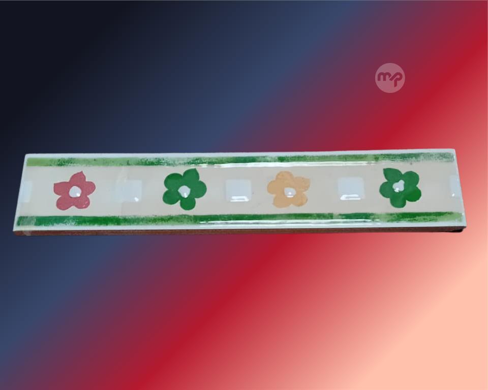 Cheerful ceramic listello with hand-painted raised daisies in alternating green, yellow, and pink, centred with white petals on a soft cream background, framed by fresh green side stripes. Playful country-garden charm – perfect for! Perfect for whimsical kitchens, kids’ bathrooms, or cottage-style features.