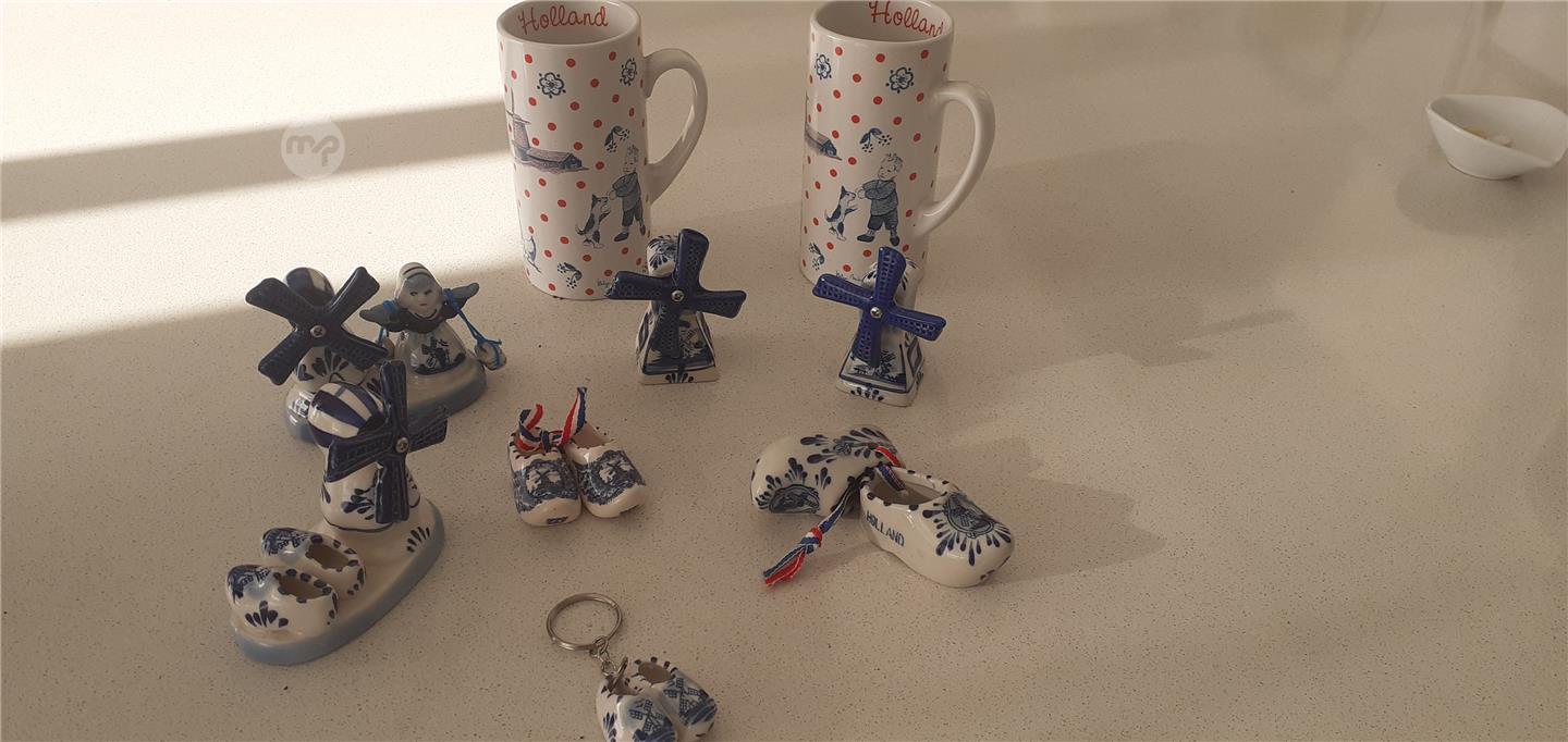Windmills, mugs and key chain and 2 Dutch shoes.