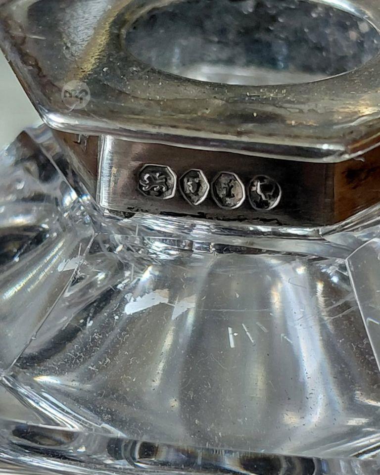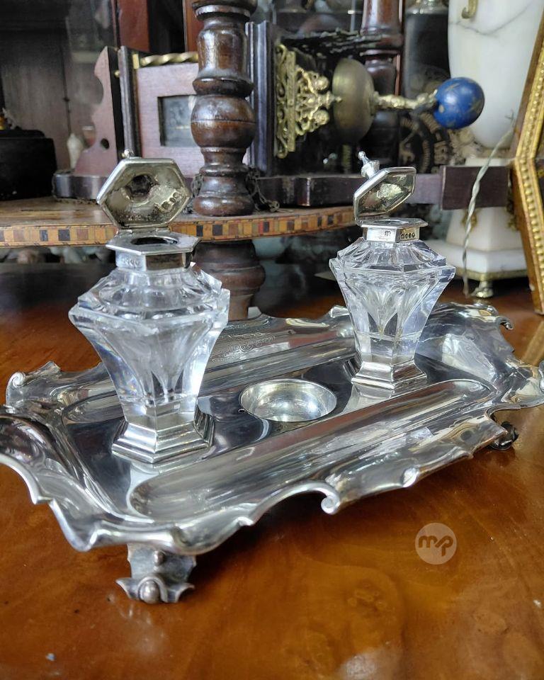 An Antique English Silver Tray double Ink well stand Complete with crystal ink
