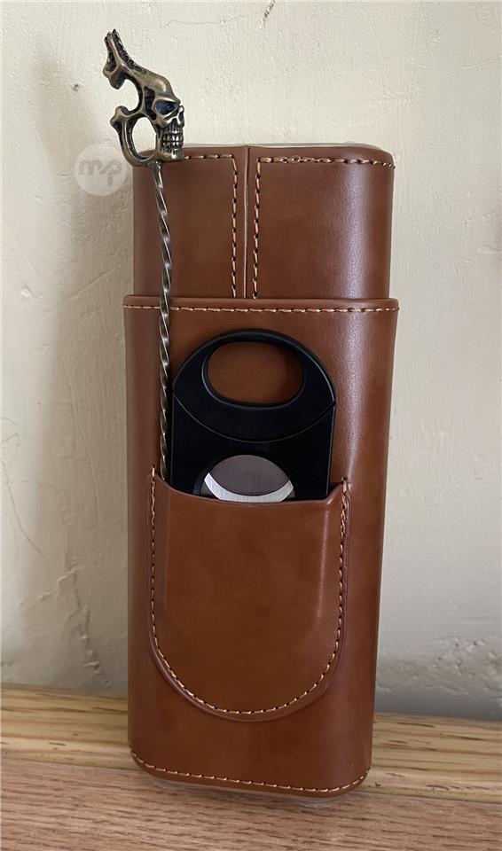 Leather Cigar Travel Case with Cutter & Skull Poker - Brown
