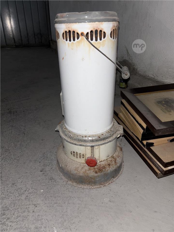Classic vintage cylindrical paraffin heater in white enamel finish. Features ventilation grilles at top, carrying handle, and control knob. Authentic period piece from mid-20th century.