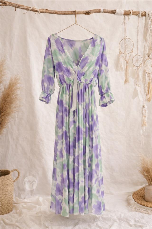 Elegant boho-style maxi dress featuring a soft watercolor tie-dye pattern in pastel green and lilac tones. The dress has a flattering V-neckline, gently fitted waist and a beautifully flowing skirt that moves naturally with the body.