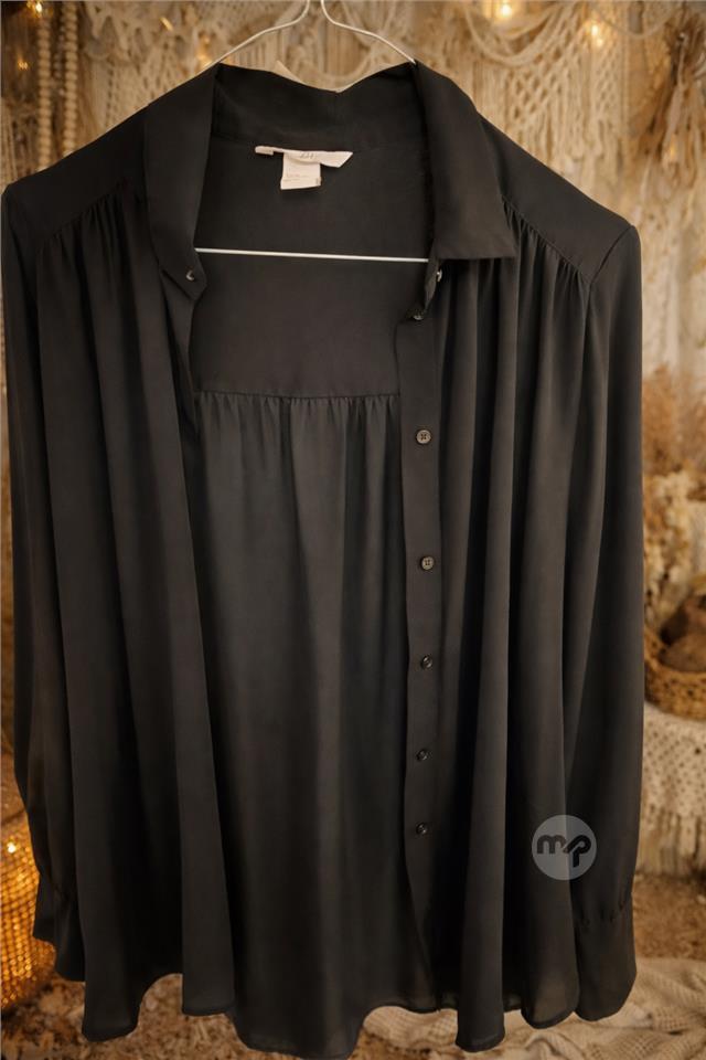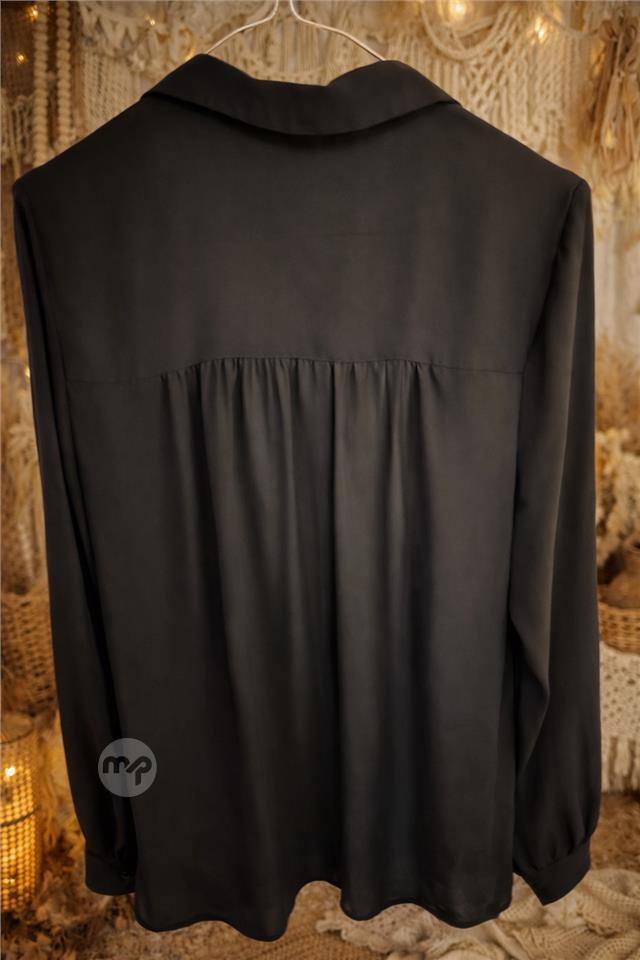 Elegant black boho-style blouse made from lightweight, softly flowing chiffon fabric. Designed with a relaxed silhouette that fits both size S and M comfortably. Features a classic collar, button-down front, long sleeves with buttoned cuffs, and a subtle pleat at the back for added movement and comfort.