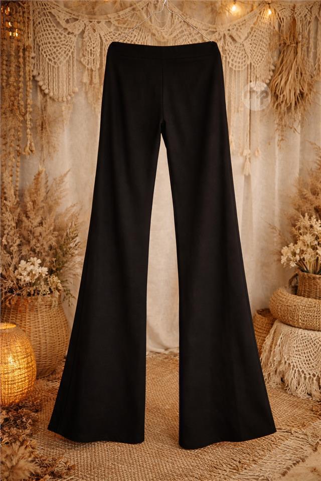 Classic black wide-leg trousers with a clean, minimalist design. Made from a soft, comfortable fabric that falls smoothly and creates an elegant silhouette. The fitted waist and slightly flared legs flatter the figure and are ideal for everyday wear as well as more dressed-up occasions.