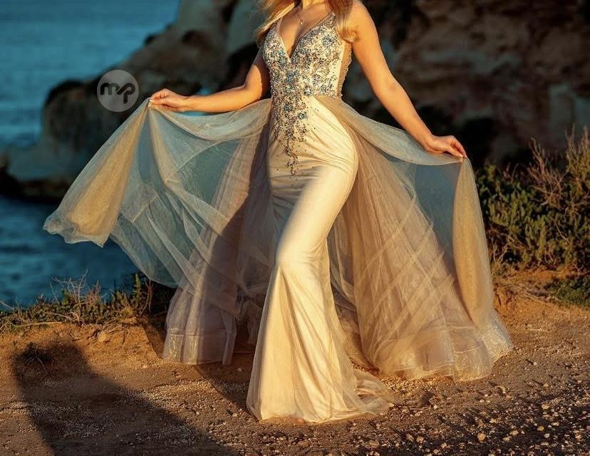 Stunning elegant evening dress featuring a beautifully fitted silhouette and a flowing tulle overlay that adds movement and a touch of glamour. The bodice is delicately embellished, creating a refined and feminine look, while the soft, flowing fabric drapes gracefully over the body.