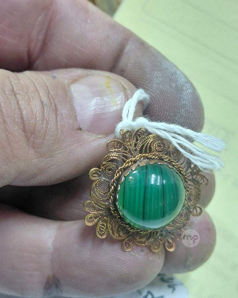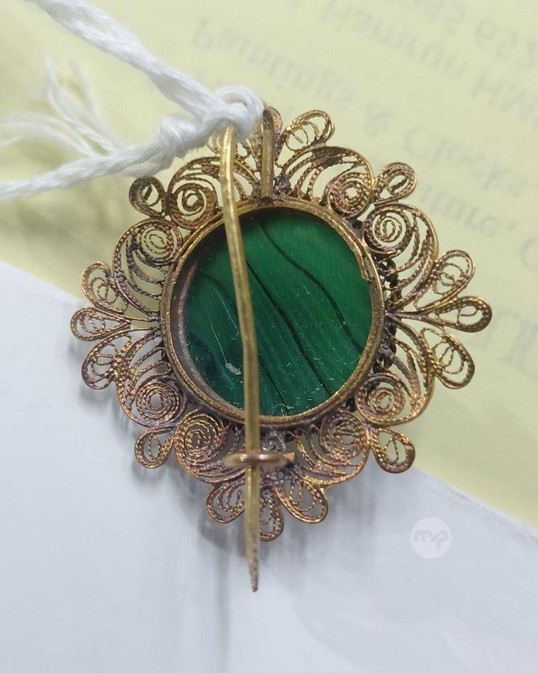 An 18crt gold Filigree Brooch Mounted with malachite stone Price of 280 euro