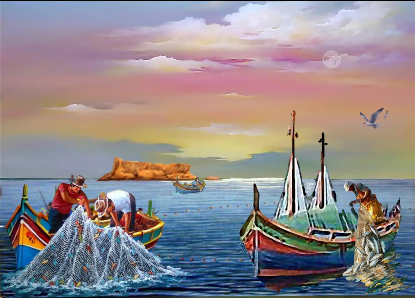 WIED IZ-ZURRIEQ FISHERMEN ----- ORIGINAL HAND PAINTING OIL ON CANVAS 70X50