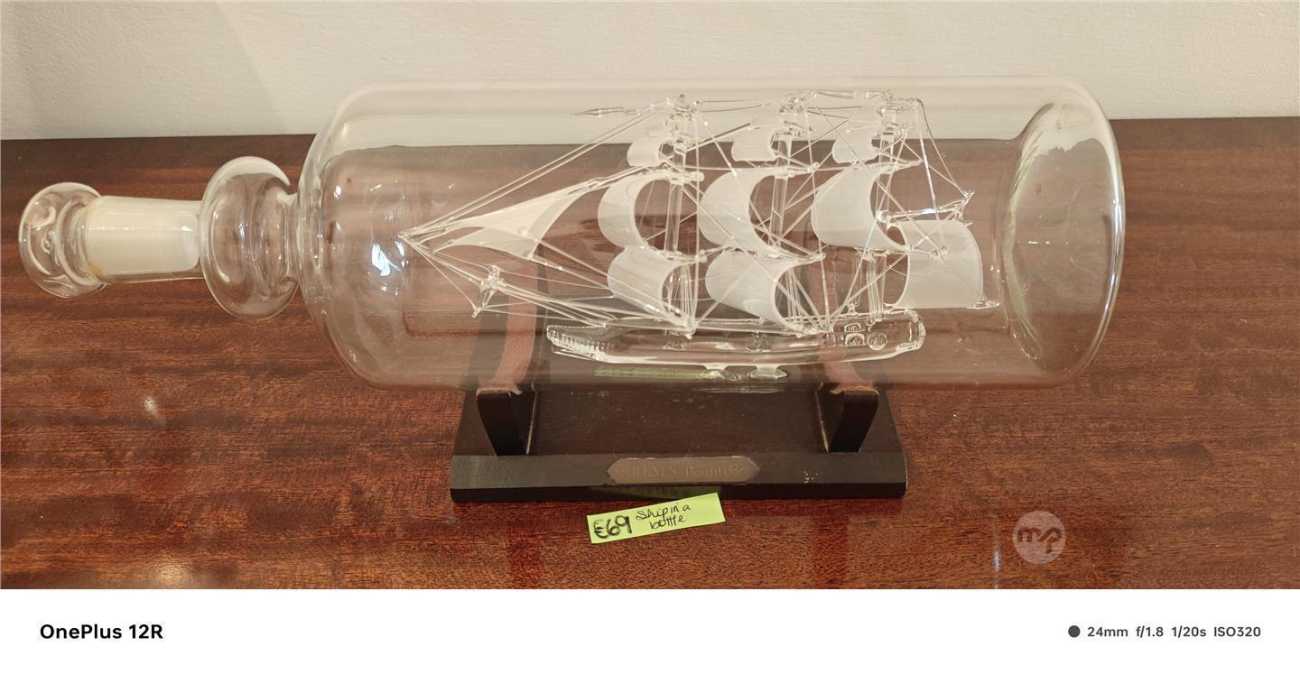 A very delicate ship (HMS Bounty)in a bottle. Very fine glass. Hand made in England.