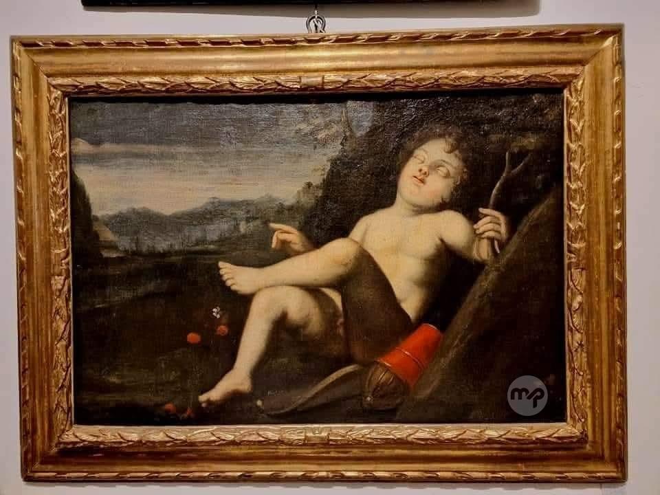 18th century Cupid painting. Approximately 300 year old lovely Cupid painting dating from the late 17th early 18th century oil on canvas painting representing Cupid with his bow and quiver by his side in original period gold leaf frame. Framed measurements are 126 cm in length and 95 cm in height. Contact Noel Borg on 9987 4751.