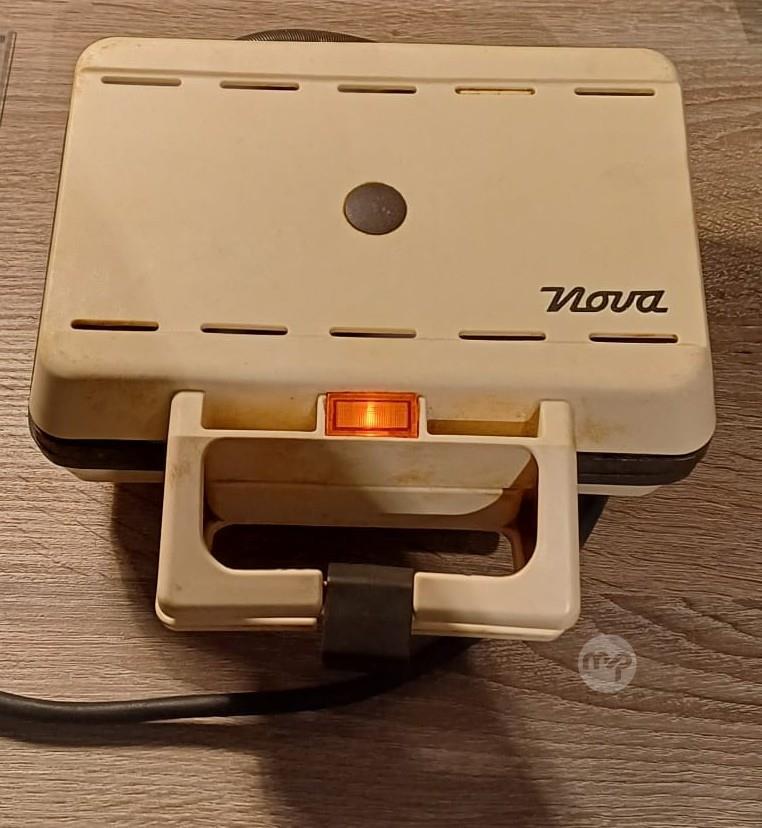 Made in Belgium. Classic retro Nova Model 216 sandwich maker in great working condition. Unlike modern toasters, this one has the sought-after "shell" plates that seal your toasties into a decorative scallop shape. Power: 600W — heats up really fast. Power-tested and working with a secure locking latch. Perfect for a vintage kitchen or making the ultimate Croque-Monsieur!