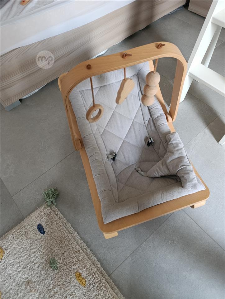 Baby Rocker Levo solid Oak designer Charlie Crane. Original price Eur 249 selling only for Eur 125 complete with hanging toys.