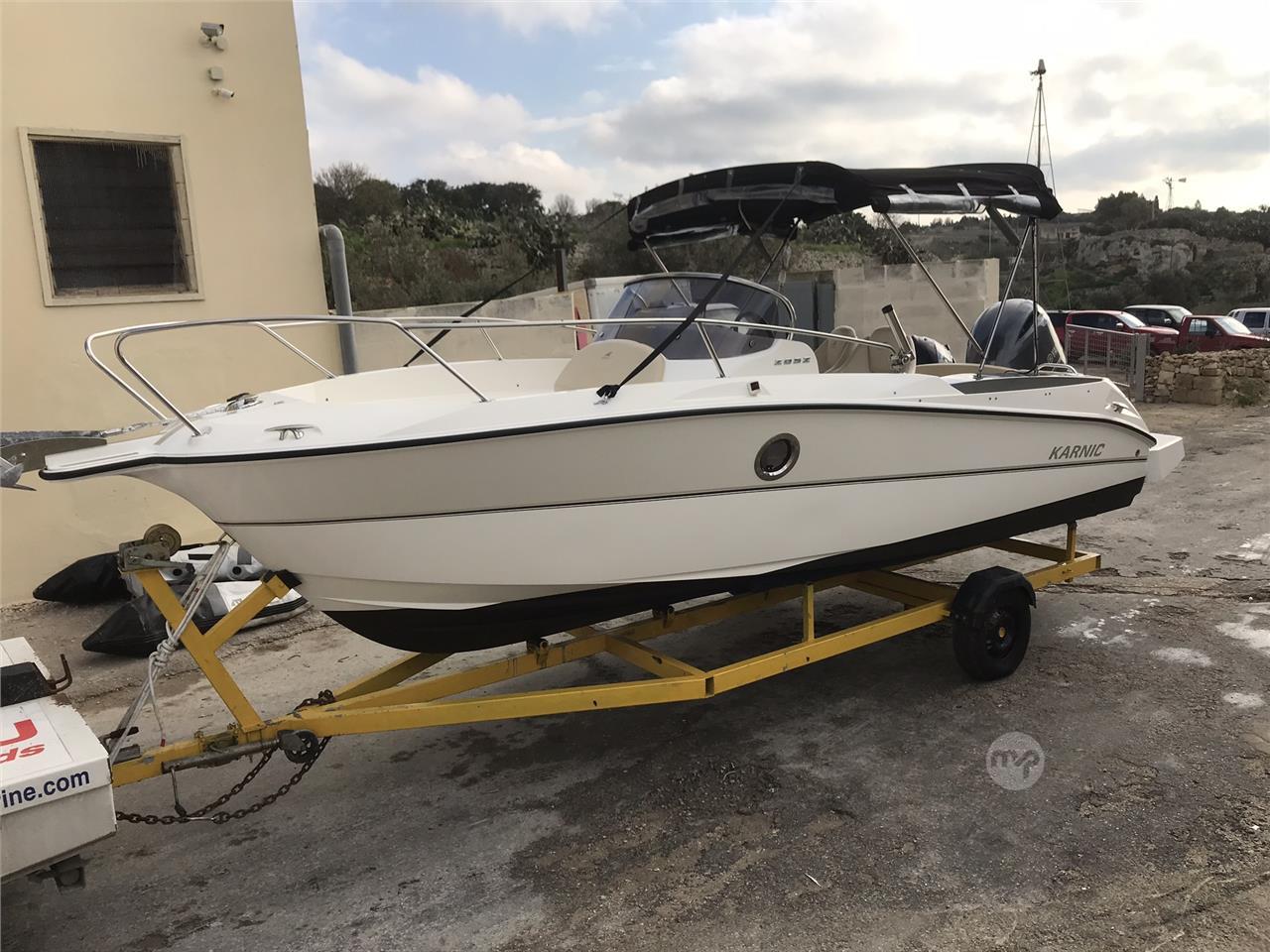 A well kept and maintained, one of a kind Karnic model Sundeck 2052 boat, powered by a Yamaha F150 four stroke 150 horsepower outboard (339 hours) and a Tohatsu 20 horsepower outboard MFS20E with electric starter (199 hours). Both always professionally serviced. Lots of extras, including a 9 inch Simrad NSS Evo 3 fishfinder/gps, a one kilowatt (high wide) through hull transducer, auto pilot system, electric anchor winch, integrated life bait well, and many more extras. Also included is a galvanized trailer.