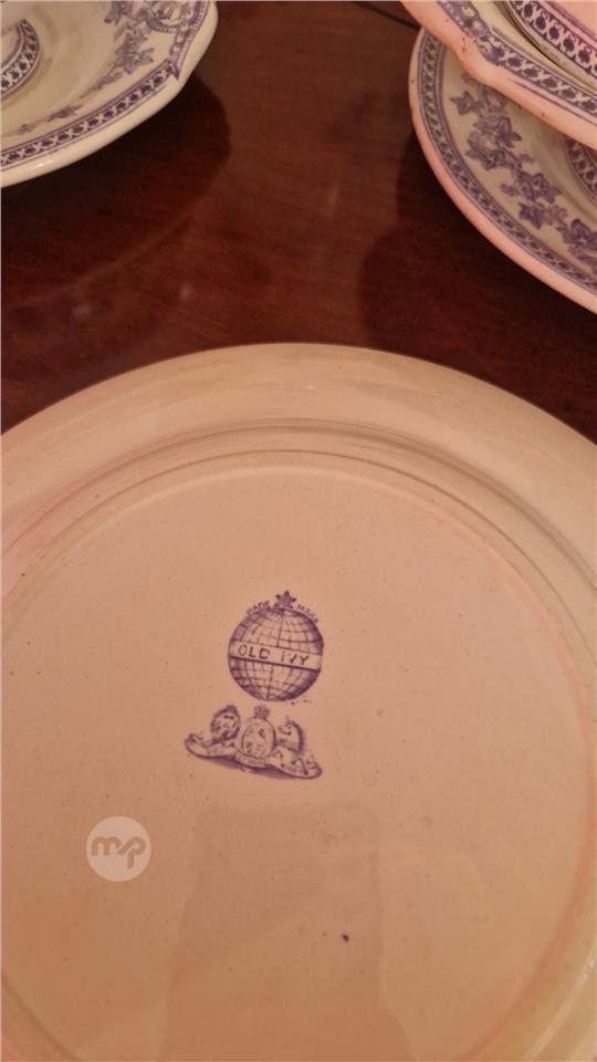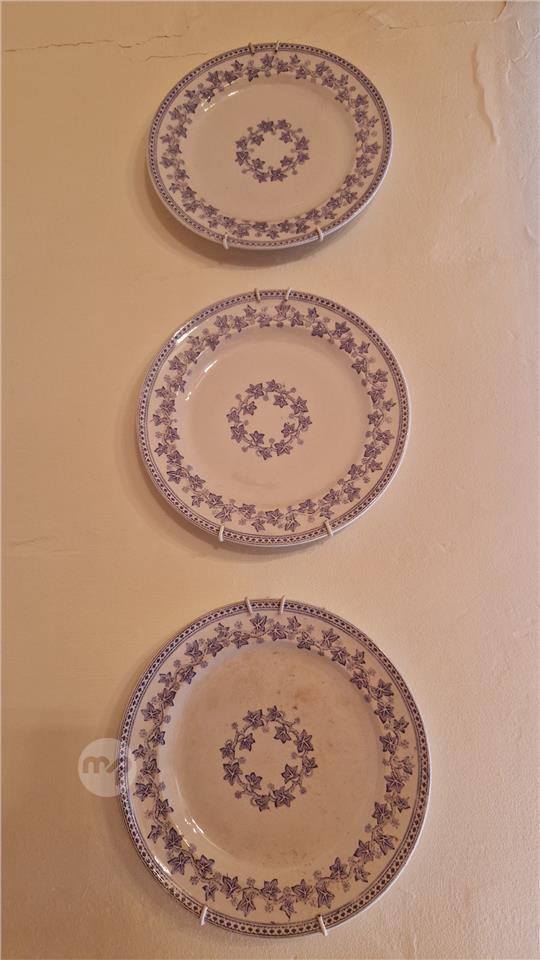 Edwardian blue & white Old Ivy part dinner service consisting of 6 hanging Dinner Plates, Soup Tureen with under plate, Saucier with under plate & spoon and a large platter. All items in great condition.