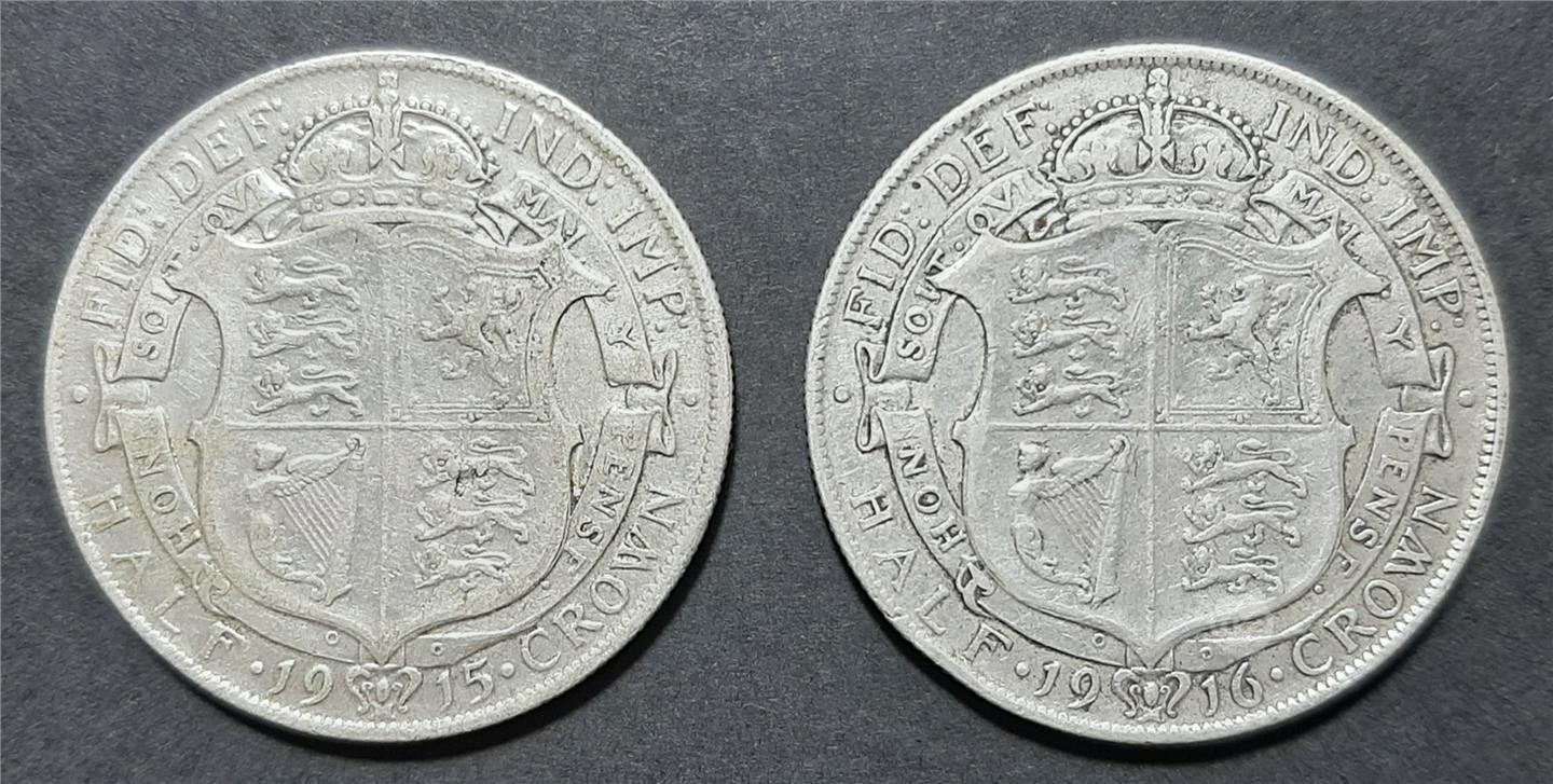 2 GEORGE V STERLING SILVER (.925) HALF CROWN COINS dated 1915 and 1916
