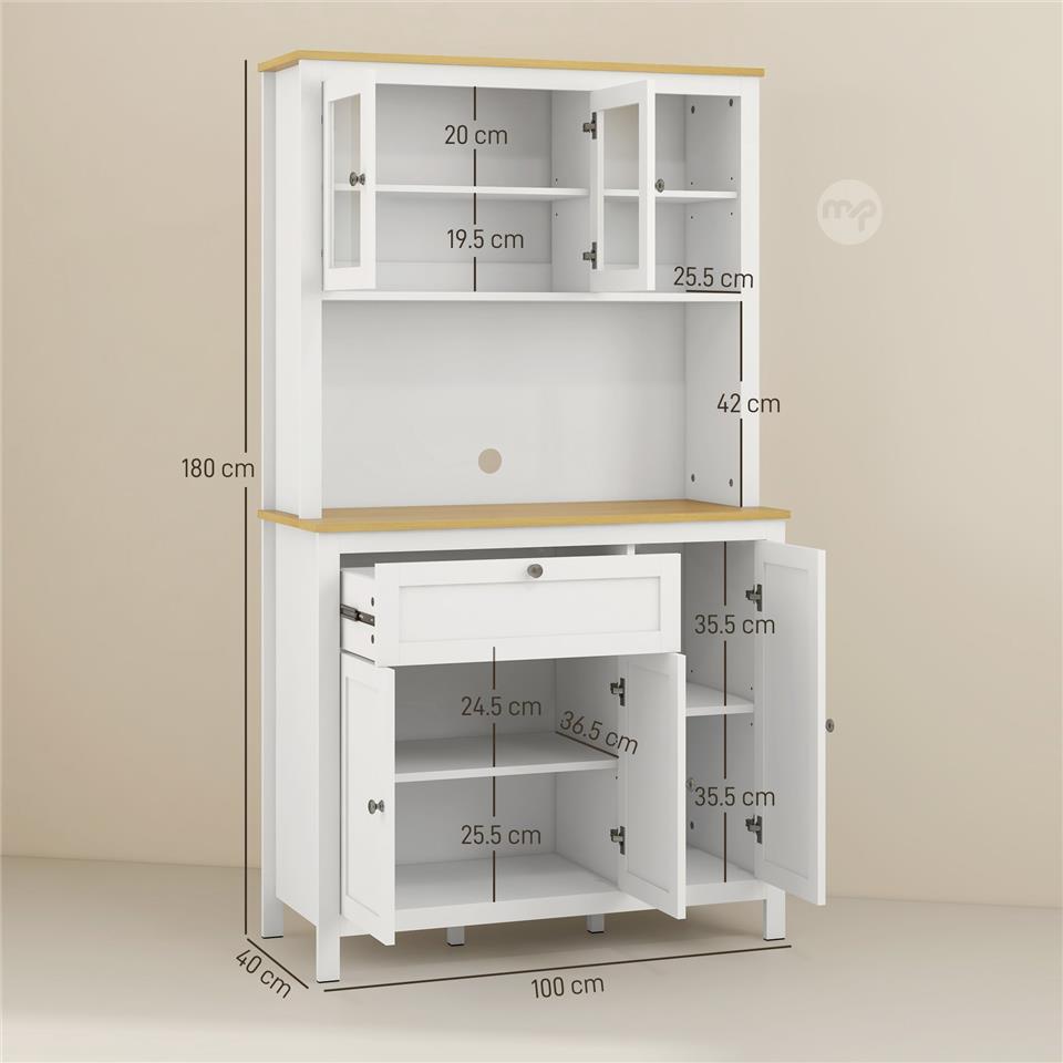 Kitchen Pantry with Drawers, Open Shelves and Adjustable Wooden Shelves, 100x40x180 cm, White