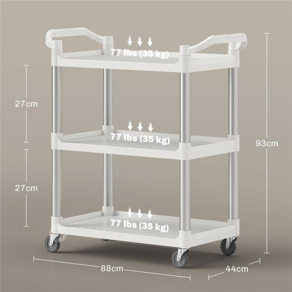 3-Tier Food Trolley in PP and Aluminum Alloy, 88x44x93 cm, White and Silver