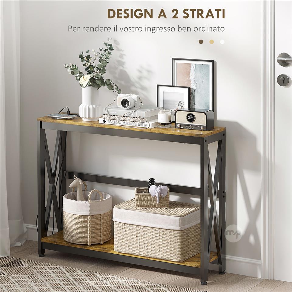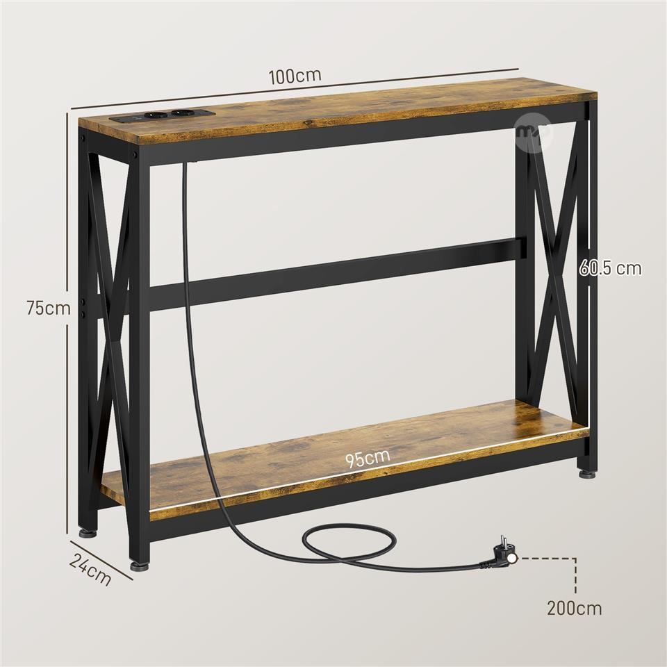 Industrial Style Hallway Console Table with Power Sockets and USB, Wood and Steel, 100x24x75cm, Brown