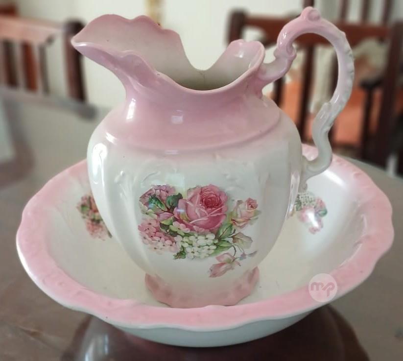 Ceramic wash set from the famous Maastricht pottery. Features beautiful rose transfers and scalloped edges.