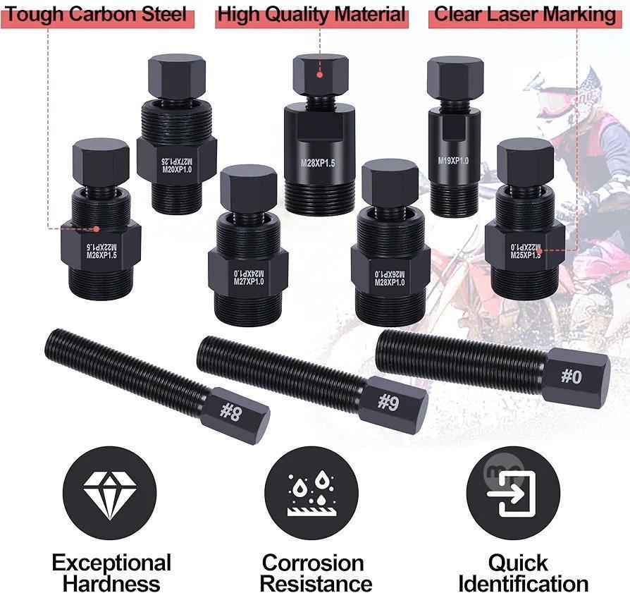 Package Includes】This motorcycle flywheel puller set with a storage box includes 10 different collets, with sizes ranging from 14mm to 28mm, fit a wide range of applications.